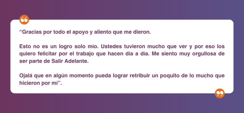 En Salir Adelante creemos que el acompañamiento no termina cuando los jóvenes egresan. Cada logro posterior también es parte de esta red que sigue creciendo, apoyando y celebrando cada paso.