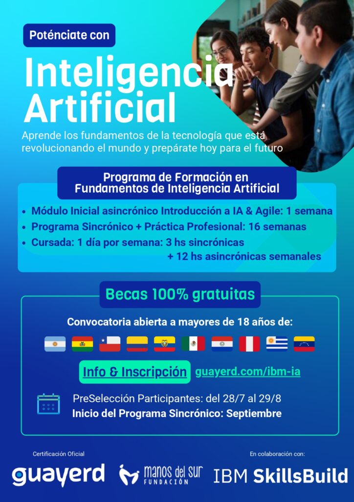 Desde Guayerd lanzamos un nuevo programa de formación 100% gratuito en Fundamentos de Inteligencia Artificial, en alianza con IBM SkillsBuild y Manos del Sur.